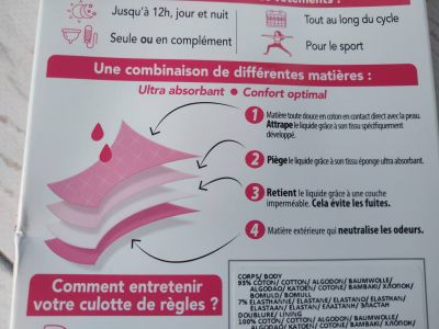 Технология 4-х слоёв: Мягкий слой — приятен к коже, быстро впитывает. Впитывающий слой — задерживает жидкость. Влагонепроницаемый слой — предотвращает протекания. Слой, нейтрализующий запахи. Материалы: хлопок, вискоза (бамбук), полиэстер, эластан.