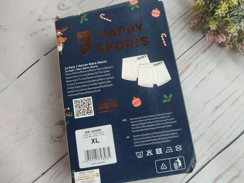 Набір з двох чоловічих ретро-боксерів Happy Shorts. Виготовлені з м'якого, дихаючого бавовняного трикотажу з додаванням еластану для комфорту та еластичності. У комплекті дві пари з новорічним принтом. Відмінно підходять для повсякденного носіння, забезпечуючи свободу рухів і зручну посадку.