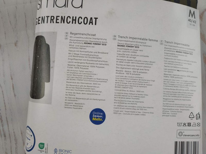 Модний жіночий тренч-дощовик Esmara із захисним покриттям BIONIC-FINISH® ECO забезпечує надійний захист від дощу та вітру. Екологічна водовідштовхувальна просочення, проклеєні шви та подовжений крій роблять цю модель ідеальною для повсякденного використання.